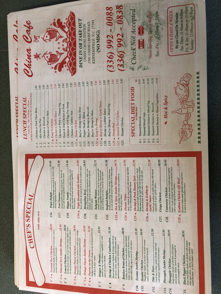 China Cafe, located in Kernersville, NC, is a popular Chinese restaurant known for its delicious food and excellent service. Customers rave about the perfectly cooked dishes, generous portions, and friendly staff. The menu offers a variety of traditional Chinese dishes, including favorites like orange chicken, sweet & sour chicken, and crab Rangoon. The food is fresh, flavorful, and satisfying, making it the perfect spot for takeout or dining in. Whether you're craving classic dishes like chicken fried rice or exploring new flavors like pad Thai noodles, China Cafe has something for everyone. With rave reviews from customers like Seth M., Kelsey R., Dan W., Scott W., and Kimberly R., this spot is a must-try for Chinese food lovers in the area.